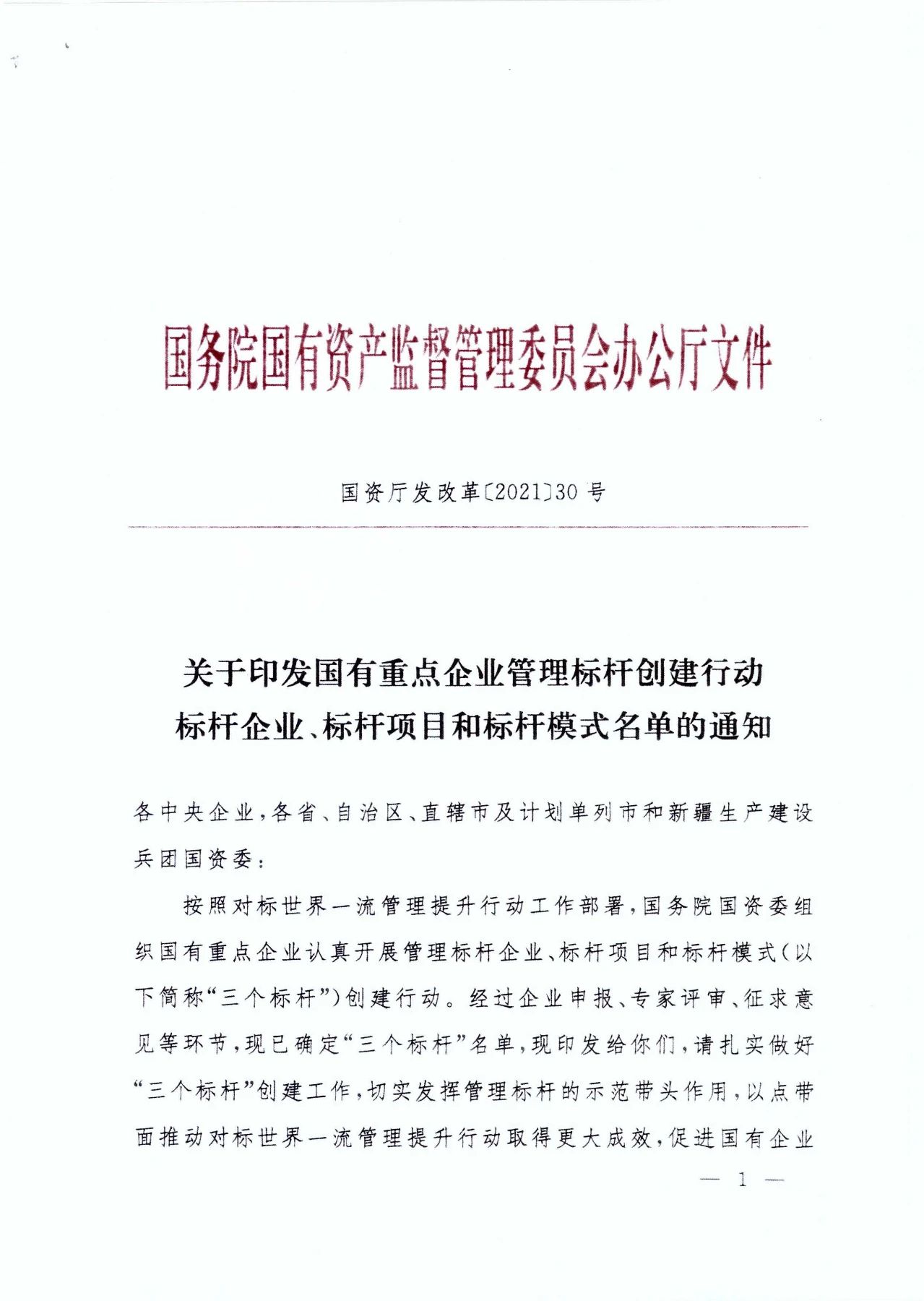 根据国务院国有资产监督管理委员会办公厅《关于印发国有重点企业管理标杆创建行动标杆企业、标杆项目和标杆模式名单的通知》(国资厅发改革[2021]30号),按照对标世界一流管理提升行动工作部署,国务院国资委组织国有重点企业认真开展管理标杆企业、标杆项目和标杆模式(以下简称“三个标杆”)创建行动。经过企业申报、专家评审、征求意见等环节,现已确定“三个标杆”名单,yibo亿博体育责任有限公司被评为国务院国资委国有重点企业管理标杆创建行动标杆企业。